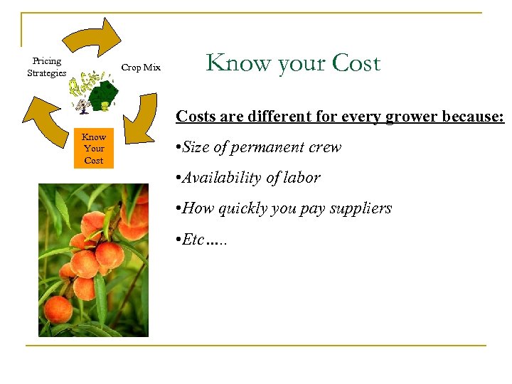 Pricing Strategies Crop Mix Know your Costs are different for every grower because: Know Your Cost • Size of permanent crew • Availability of labor • How quickly you pay suppliers • Etc…. .