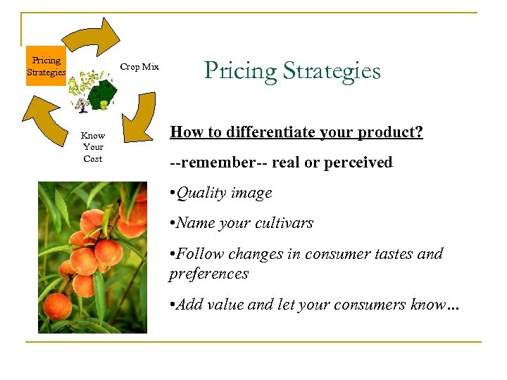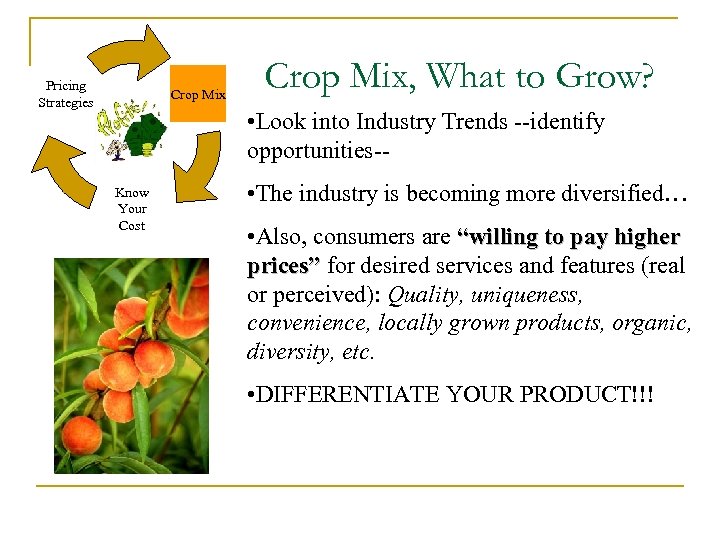 Pricing Strategies Crop Mix, What to Grow? • Look into Industry Trends --identify opportunities-- Know Your Cost • The industry is becoming more diversified… • Also, consumers are “willing to pay higher prices” for desired services and features (real or perceived): Quality, uniqueness, convenience, locally grown products, organic, diversity, etc. • DIFFERENTIATE YOUR PRODUCT!!!