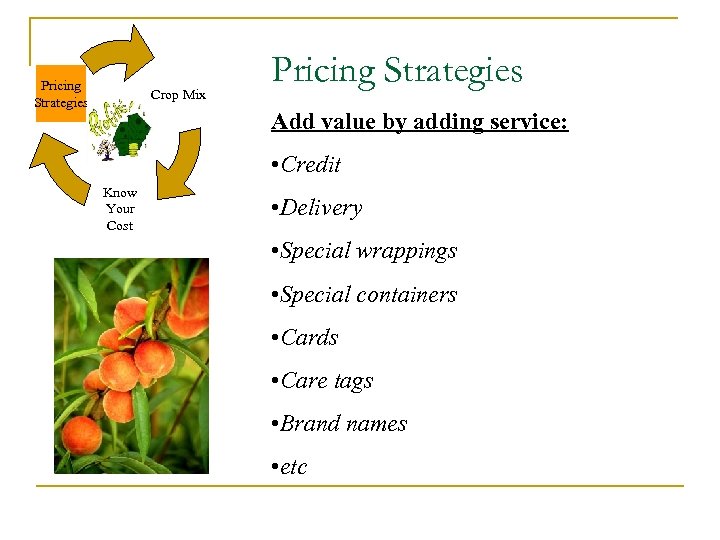 Pricing Strategies Crop Mix Pricing Strategies Add value by adding service: • Credit Know Your Cost • Delivery • Special wrappings • Special containers • Cards • Care tags • Brand names • etc