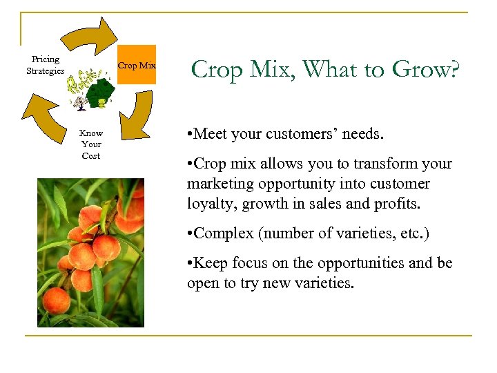 Pricing Strategies Crop Mix Know Your Cost Crop Mix, What to Grow? • Meet your customers’ needs. • Crop mix allows you to transform your marketing opportunity into customer loyalty, growth in sales and profits. • Complex (number of varieties, etc. ) • Keep focus on the opportunities and be open to try new varieties.