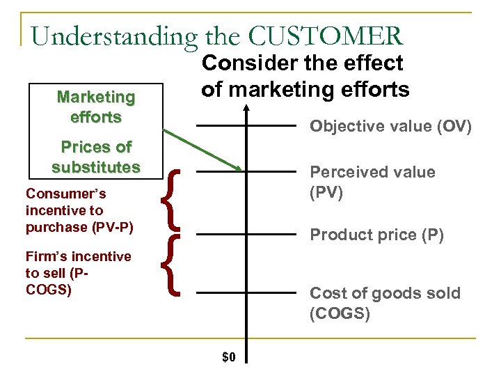 Understanding the CUSTOMER Consider the effect of marketing efforts Marketing efforts Prices of substitutes Consumer’s incentive to purchase (PV-P) Firm’s incentive to sell (PCOGS) Objective value (OV) { { Perceived value (PV) Product price (P) Cost of goods sold (COGS) $0