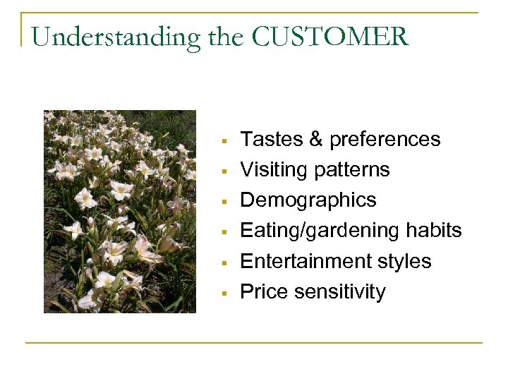 Understanding the CUSTOMER § § § Tastes & preferences Visiting patterns Demographics Eating/gardening habits Entertainment styles Price sensitivity