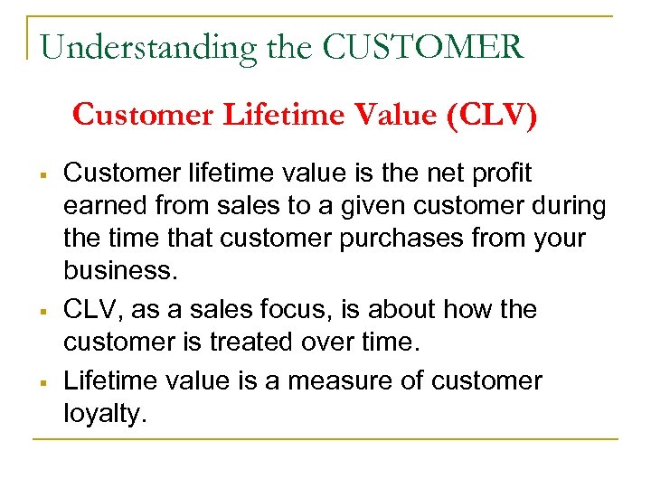Understanding the CUSTOMER Customer Lifetime Value (CLV) § § § Customer lifetime value is the net profit earned from sales to a given customer during the time that customer purchases from your business. CLV, as a sales focus, is about how the customer is treated over time. Lifetime value is a measure of customer loyalty.