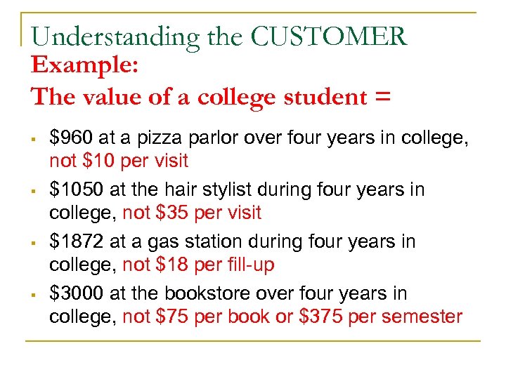 Understanding the CUSTOMER Example: The value of a college student = § § $960 at a pizza parlor over four years in college, not $10 per visit $1050 at the hair stylist during four years in college, not $35 per visit $1872 at a gas station during four years in college, not $18 per fill-up $3000 at the bookstore over four years in college, not $75 per book or $375 per semester