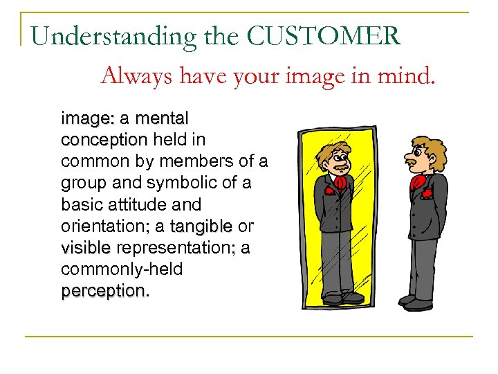 Understanding the CUSTOMER Always have your image in mind. image: a mental conception held in common by members of a group and symbolic of a basic attitude and orientation; a tangible or visible representation; a commonly-held perception