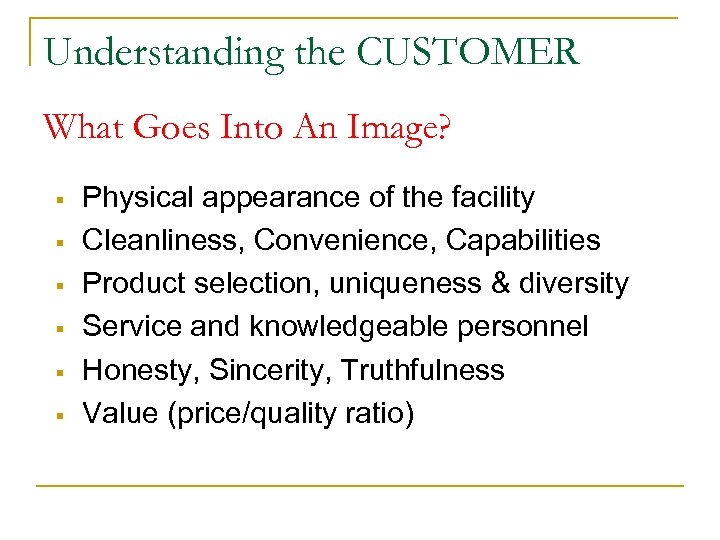 Understanding the CUSTOMER What Goes Into An Image? § § § Physical appearance of the facility Cleanliness, Convenience, Capabilities Product selection, uniqueness & diversity Service and knowledgeable personnel Honesty, Sincerity, Truthfulness Value (price/quality ratio)