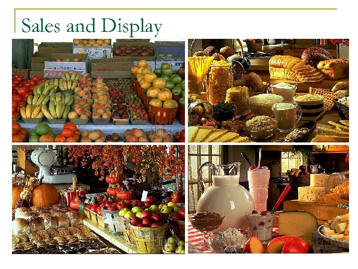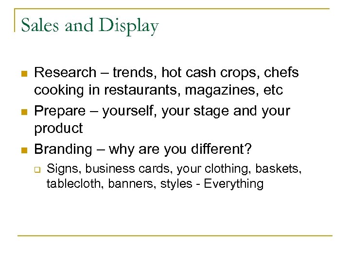Sales and Display n n n Research – trends, hot cash crops, chefs cooking in restaurants, magazines, etc Prepare – yourself, your stage and your product Branding – why are you different? q Signs, business cards, your clothing, baskets, tablecloth, banners, styles - Everything