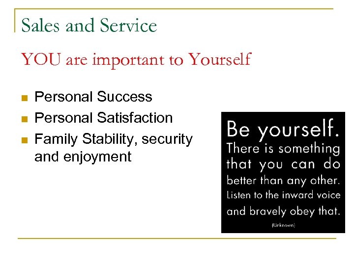 Sales and Service YOU are important to Yourself n n n Personal Success Personal Satisfaction Family Stability, security and enjoyment