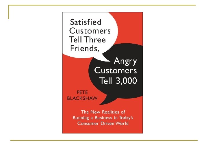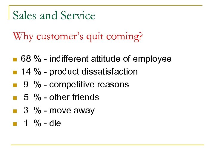Sales and Service Why customer’s quit coming? n n n 68 % - indifferent attitude of employee 14 % - product dissatisfaction 9 % - competitive reasons 5 % - other friends 3 % - move away 1 % - die
