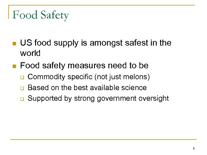 Food Safety n n US food supply is amongst safest in the world Food safety measures need to be q q q Commodity specific (not just melons) Based on the best available science Supported by strong government oversight 8