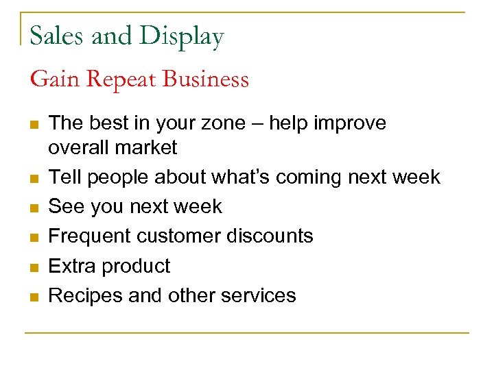 Sales and Display Gain Repeat Business n n n The best in your zone – help improve overall market Tell people about what’s coming next week See you next week Frequent customer discounts Extra product Recipes and other services