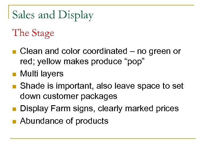 Sales and Display The Stage n n n Clean and color coordinated – no green or red; yellow makes produce “pop” Multi layers Shade is important, also leave space to set down customer packages Display Farm signs, clearly marked prices Abundance of products