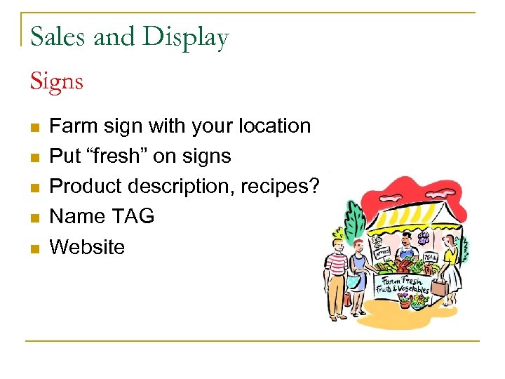 Sales and Display Signs n n n Farm sign with your location Put “fresh” on signs Product description, recipes? Name TAG Website