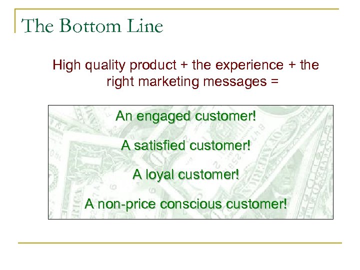 The Bottom Line High quality product + the experience + the right marketing messages = An engaged customer! A satisfied customer! A loyal customer! A non-price conscious customer!