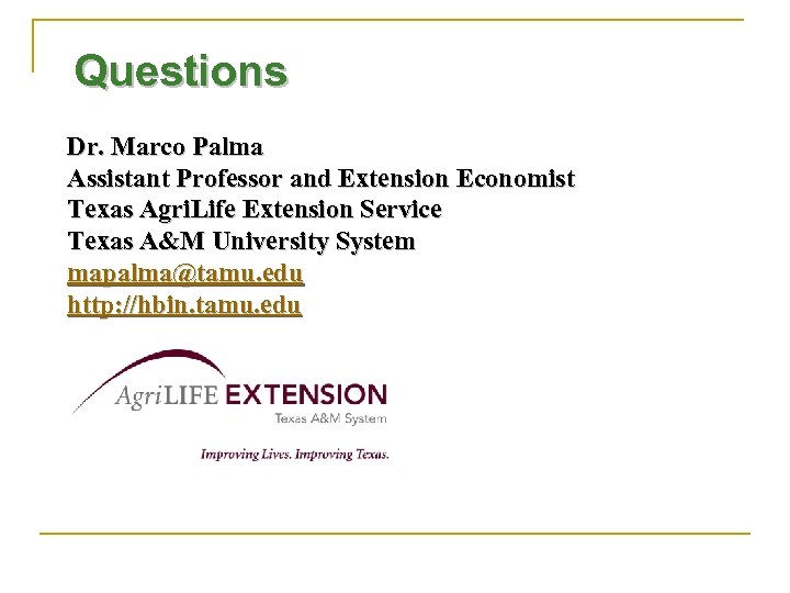 Questions Dr. Marco Palma Assistant Professor and Extension Economist Texas Agri. Life Extension Service Texas A&M University System mapalma@tamu. edu http: //hbin. tamu. edu
