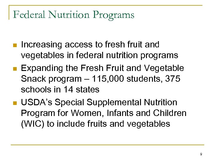 Federal Nutrition Programs n n n Increasing access to fresh fruit and vegetables in federal nutrition programs Expanding the Fresh Fruit and Vegetable Snack program – 115, 000 students, 375 schools in 14 states USDA’s Special Supplemental Nutrition Program for Women, Infants and Children (WIC) to include fruits and vegetables 9