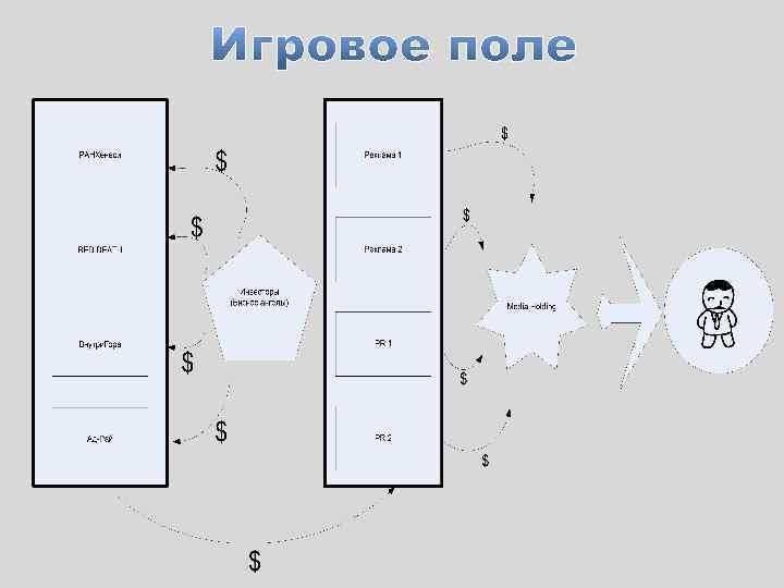 • • • Рекламные и PR агентства: реализация маркетинговой кампании. Проекты: контроль за деятельностью рекламного и PR агентства и привлечение инвестиционных средств. Бизнес - ангелы: инвестирование проектов, маркетинговые исследования. Медиа-холдинг: распределение ресурсов. Население: рефлексия рекламных роликов.