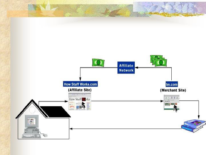 Programas de Afiliación n Son arreglos en los cuales un web site de comercio le paga a un web site de afiliación una comisión por generar tráfico a la tienda.