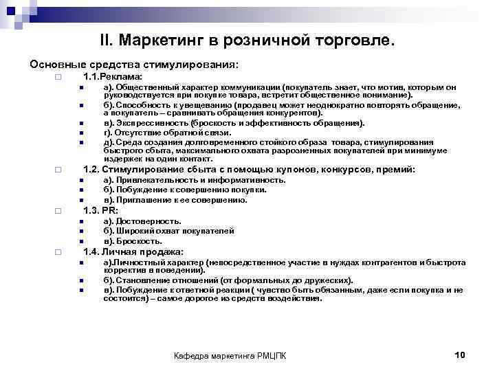 II. Маркетинг в розничной торговле. Основные средства стимулирования: ¨ 1. 1. Реклама: n n n ¨ 1. 2. Стимулирование сбыта с помощью купонов, конкурсов, премий: n n n ¨ а). Привлекательность и информативность. б). Побуждение к совершению покупки. в). Приглашение к ее совершению. 1. 3. PR: n n n ¨ а). Общественный характер коммуникации (покупатель знает, что мотив, которым он руководствуется при покупке товара, встретит общественное понимание). б). Способность к увещеванию (продавец может неоднократно повторять обращение, а покупатель – сравнивать обращения конкурентов). Экспрессивность (броскость и эффективность обращения). г). Отсутствие обратной связи. д). Среда создания долговременного стойкого образа товара, стимулирования быстрого сбыта, максимального охвата разрозненных покупателей при минимуме издержек на один контакт. а). Достоверность. б). Широкий охват покупателей в). Броскость. 1. 4. Личная продажа: n n n а). Личностный характер (непосредственное участие в нуждах контрагентов и быстрота корректив в поведении). б). Становление отношений (от формальных до дружеских). в). Побуждение к ответной реакции ( чувство быть обязанным, даже если покупка и не состоится) – самое дорогое из средств воздействия. Кафедра маркетинга РМЦПК 10
