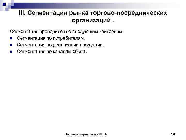 III. Сегментация рынка торгово-посреднических организаций. Сегментация проводится по следующим критериям: n Сегментация по потребителям, n Сегментация по реализации продукции. n Сегментация по каналам сбыта. Кафедра маркетинга РМЦПК 13