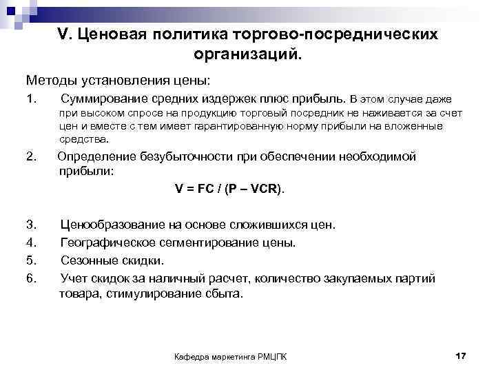 V. Ценовая политика торгово-посреднических организаций. Методы установления цены: 1. Суммирование средних издержек плюс прибыль. В этом случае даже при высоком спросе на продукцию торговый посредник не наживается за счет цен и вместе с тем имеет гарантированную норму прибыли на вложенные средства. 2. Определение безубыточности при обеспечении необходимой прибыли: V = FC / (P – VCR). 3. 4. 5. 6. Ценообразование на основе сложившихся цен. Географическое сегментирование цены. Сезонные скидки. Учет скидок за наличный расчет, количество закупаемых партий товара, стимулирование сбыта. Кафедра маркетинга РМЦПК 17
