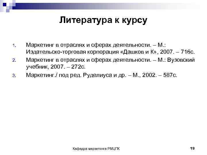 Литература к курсу 1. 2. 3. Маркетинг в отраслях и сферах деятельности. – М. : Издательско-торговая корпорация «Дашков и К» , 2007. – 716 с. Маркетинг в отраслях и сферах деятельности. – М. : Вузовский учебник, 2007. – 272 с. Маркетинг. / под ред. Руделиуса и др. – М. , 2002. – 587 с. Кафедра маркетинга РМЦПК 19