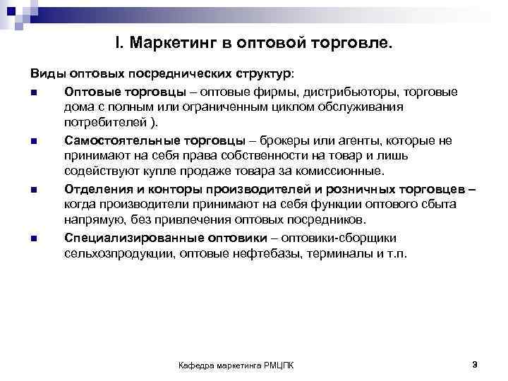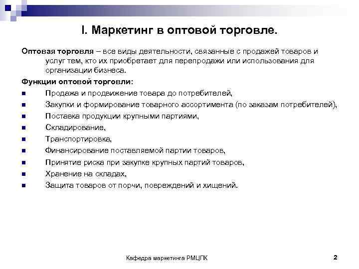 I. Маркетинг в оптовой торговле. Оптовая торговля – все виды деятельности, связанные с продажей товаров и услуг тем, кто их приобретает для перепродажи или использования для организации бизнеса. Функции оптовой торговли: n Продажа и продвижение товара до потребителей, n Закупки и формирование товарного ассортимента (по заказам потребителей), n Поставка продукции крупными партиями, n Складирование, n Транспортировка, n Финансирование поставляемой партии товаров, n Принятие риска при закупке крупных партий товаров, n Хранение на складах, n Защита товаров от порчи, повреждений и хищений. Кафедра маркетинга РМЦПК 2