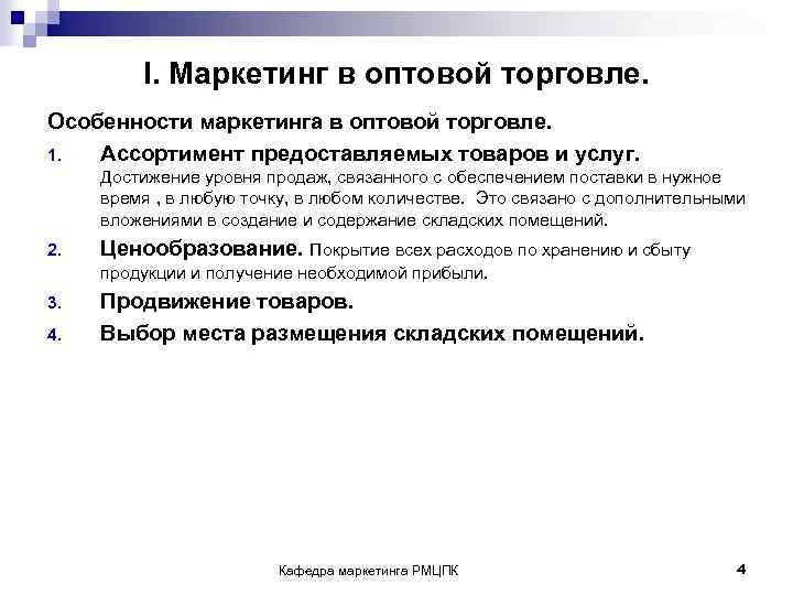 I. Маркетинг в оптовой торговле. Особенности маркетинга в оптовой торговле. 1. Ассортимент предоставляемых товаров и услуг. Достижение уровня продаж, связанного с обеспечением поставки в нужное время , в любую точку, в любом количестве. Это связано с дополнительными вложениями в создание и содержание складских помещений. 2. Ценообразование. Покрытие всех расходов по хранению и сбыту продукции и получение необходимой прибыли. 3. 4. Продвижение товаров. Выбор места размещения складских помещений. Кафедра маркетинга РМЦПК 4