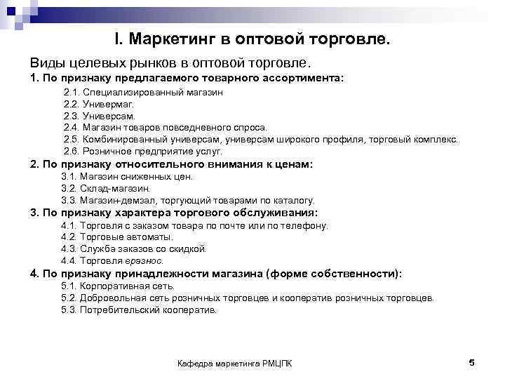 I. Маркетинг в оптовой торговле. Виды целевых рынков в оптовой торговле. 1. По признаку предлагаемого товарного ассортимента: 2. 1. Специализированный магазин 2. 2. Универмаг. 2. 3. Универсам. 2. 4. Магазин товаров повседневного спроса. 2. 5. Комбинированный универсам, универсам широкого профиля, торговый комплекс. 2. 6. Розничное предприятие услуг. 2. По признаку относительного внимания к ценам: 3. 1. Магазин сниженных цен. 3. 2. Склад-магазин. 3. 3. Магазин-демзал, торгующий товарами по каталогу. 3. По признаку характера торгового обслуживания: 4. 1. Торговля с заказом товара по почте или по телефону. 4. 2. Торговые автоматы. 4. 3. Служба заказов со скидкой. 4. 4. Торговля вразнос. 4. По признаку принадлежности магазина (форме собственности): 5. 1. Корпоративная сеть. 5. 2. Добровольная сеть розничных торговцев и кооператив розничных торговцев. 5. 3. Потребительский кооператив. Кафедра маркетинга РМЦПК 5