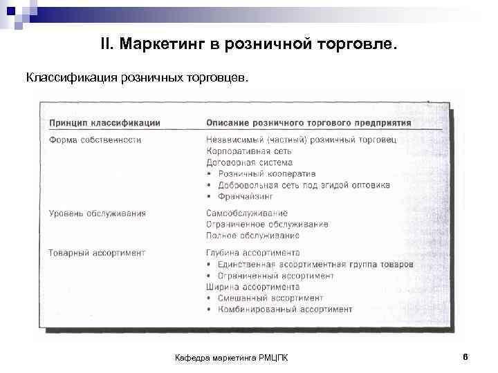 II. Маркетинг в розничной торговле. Классификация розничных торговцев. Кафедра маркетинга РМЦПК 6
