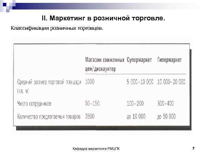II. Маркетинг в розничной торговле. Классификация розничных торговцев. Кафедра маркетинга РМЦПК 7