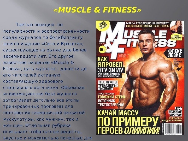 Сегодня существует масса специализированной литературы, посвященной построению тела, уходу за ним, питанию и т. д. Эта презентация нацелена провести объективный обзор самых популярных и востребованных журналов по бодибилдингу на российском рынке печатной продукции, а так же обзор сайтов и соц-сетей. Итак, топ 5 известных русскоязычных журналов, прославляющих культ здорового тела: