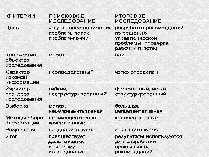 ТИПЫ ИССЛЕДОВАНИЙ В процессе планирования, после определения цели и задач, исследователь должен четко определить тип проводимого маркетингового исследования. Тип исследования напрямую определяет методы сбора информации, характер выборки, степень точности исследования и др. Различают ПОИСКОВЫЕ и ИТОГОВЫЕ ИССЛЕДОВАНИЯ.