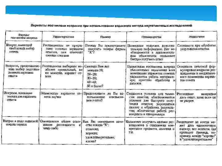 Вопросы менеджера перед началом исследования Какие данные необходимы для создания требуемой информации? Где лучше получить вторичную информацию — из внутренних или из внешних источников? Требуется ли дополнительно, кроме вторичной информации, получение данных за счет первичной информации? Какие статистические методы и модели потребуются для обработки вторичной информации? Какие исследования следует провести, чтобы получить первичную информацию? Какие переменные факторы будут измеряться при исследовании и с помощью каких приемов? Какие анкеты для опроса будут использоваться (структурированные, неструктурированные)? Какие вопросы задать и как контактировать с респондентами? Каковы выборка исследования, размер панели? Какие методы анализа полученных данных будут применяться? Определены ли форма, вид и структура отчета о проведении исследования? Сколько времени и затрат потребуется для выполнения исследования?