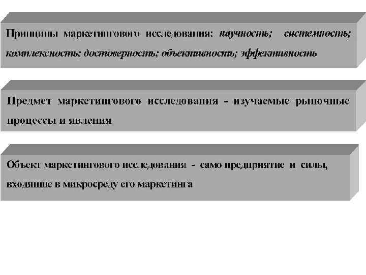 7 Принципов МИ: • научность, т. е. объяснение и предсказание изучаемых рыночных явлений и процессов на основе научных положений и объективно полученных данных, а также выявление закономерностей развития этих явлений и процессов; • системность, т. е. выделение отдельных структурных элементов, составляющих явление, обнаружение иерархической связи и взаимоподчиненности;