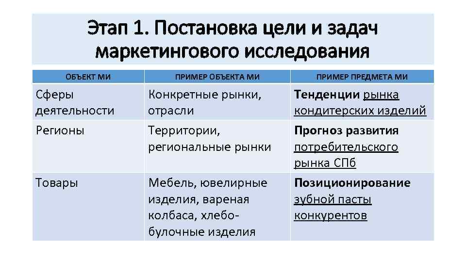 Этап 1. Постановка цели и задач маркетингового исследования ОБЪЕКТ МИ ПРИМЕР ОБЪЕКТА МИ Сферы деятельности Регионы Конкретные рынки, отрасли Территории, региональные рынки Товары Мебель, ювелирные изделия, вареная колбаса, хлебо булочные изделия ПРИМЕР ПРЕДМЕТА МИ Тенденции рынка кондитерских изделий Прогноз развития потребительского рынка СПб Позиционирование зубной пасты конкурентов