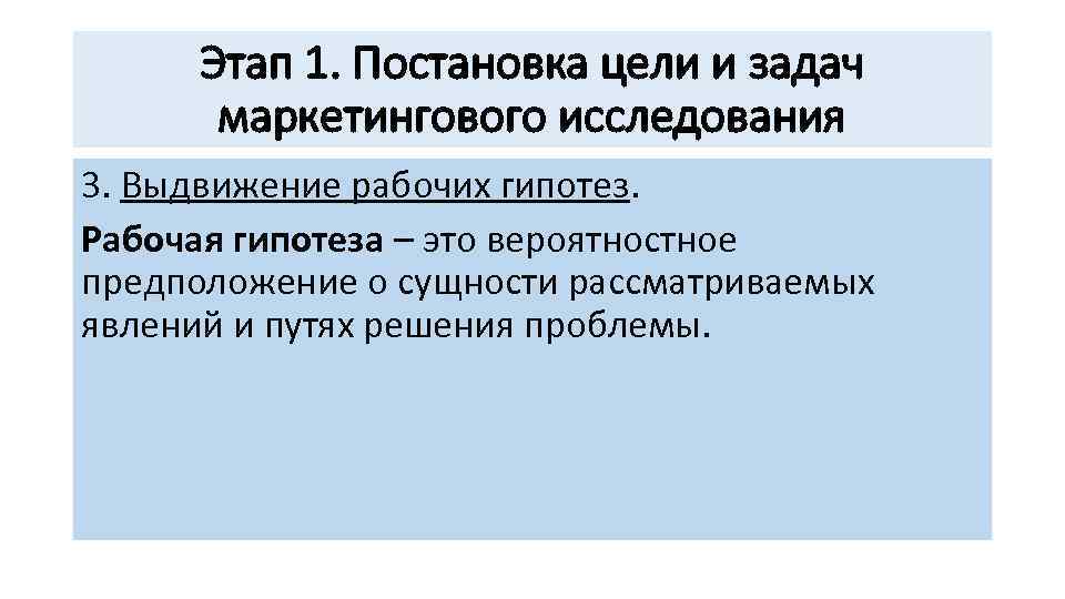 Этап 1. Постановка цели и задач маркетингового исследования 3. Выдвижение рабочих гипотез. Рабочая гипотеза – это вероятностное предположение о сущности рассматриваемых явлений и путях решения проблемы.