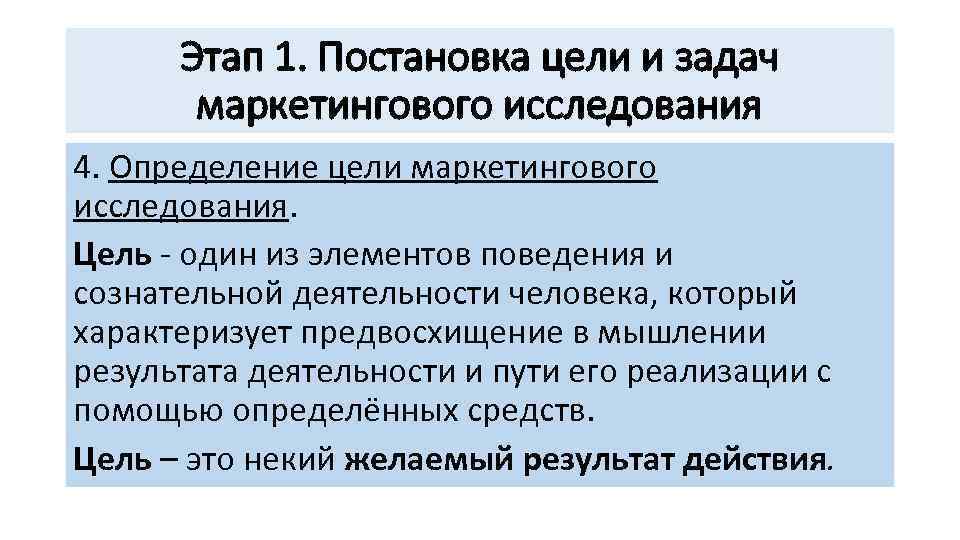 Этап 1. Постановка цели и задач маркетингового исследования 4. Определение цели маркетингового исследования. Цель один из элементов поведения и сознательной деятельности человека, который характеризует предвосхищение в мышлении результата деятельности и пути его реализации с помощью определённых средств. Цель – это некий желаемый результат действия.