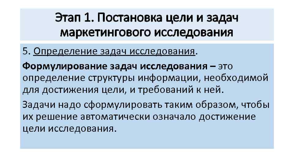 Этап 1. Постановка цели и задач маркетингового исследования 5. Определение задач исследования. Формулирование задач исследования – это определение структуры информации, необходимой для достижения цели, и требований к ней. Задачи надо сформулировать таким образом, чтобы их решение автоматически означало достижение цели исследования.