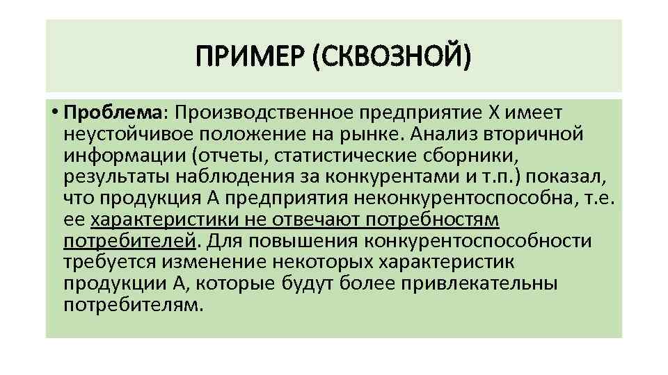 ПРИМЕР (СКВОЗНОЙ) • Проблема: Производственное предприятие Х имеет неустойчивое положение на рынке. Анализ вторичной информации (отчеты, статистические сборники, результаты наблюдения за конкурентами и т. п. ) показал, что продукция А предприятия неконкурентоспособна, т. е. ее характеристики не отвечают потребностям потребителей. Для повышения конкурентоспособности требуется изменение некоторых характеристик продукции А, которые будут более привлекательны потребителям.