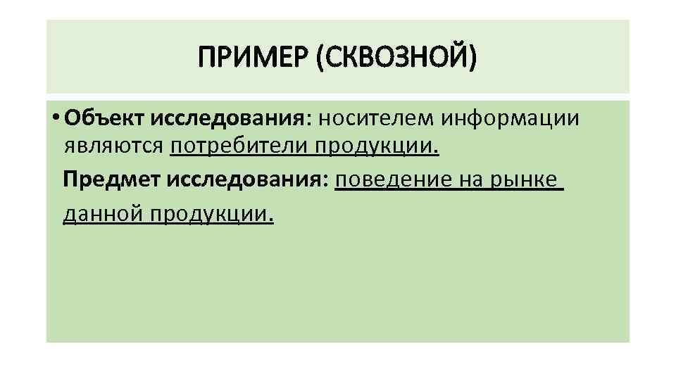 ПРИМЕР (СКВОЗНОЙ) • Объект исследования: носителем информации являются потребители продукции. Предмет исследования: поведение на рынке данной продукции.