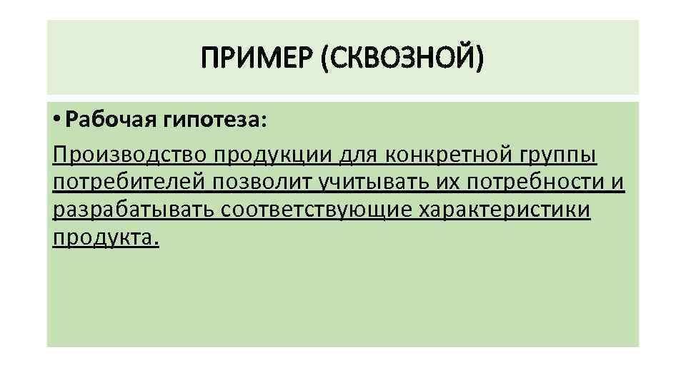 ПРИМЕР (СКВОЗНОЙ) • Рабочая гипотеза: Производство продукции для конкретной группы потребителей позволит учитывать их потребности и разрабатывать соответствующие характеристики продукта.
