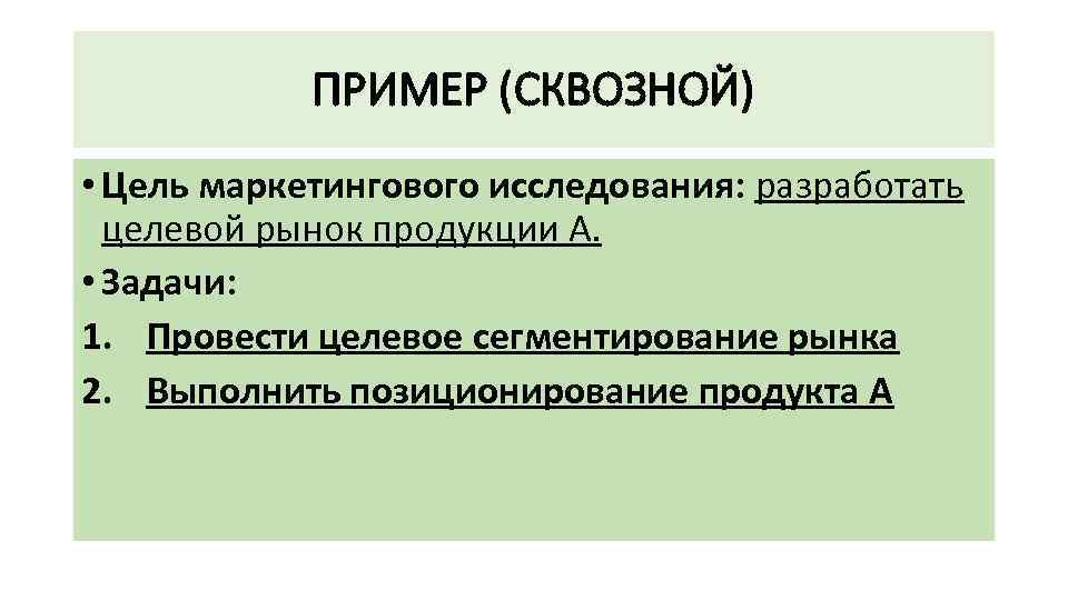 ПРИМЕР (СКВОЗНОЙ) • Цель маркетингового исследования: разработать целевой рынок продукции А. • Задачи: 1. Провести целевое сегментирование рынка 2. Выполнить позиционирование продукта А
