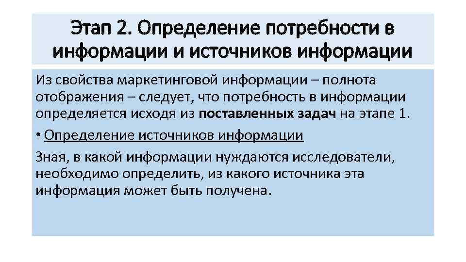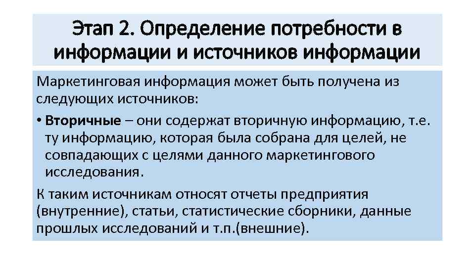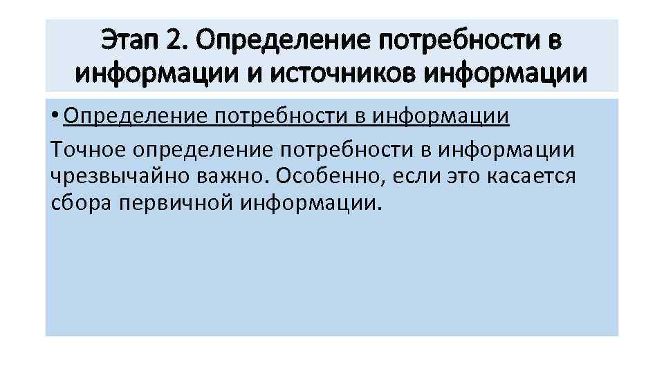 Этап 2. Определение потребности в информации и источников информации • Определение потребности в информации Точное определение потребности в информации чрезвычайно важно. Особенно, если это касается сбора первичной информации.