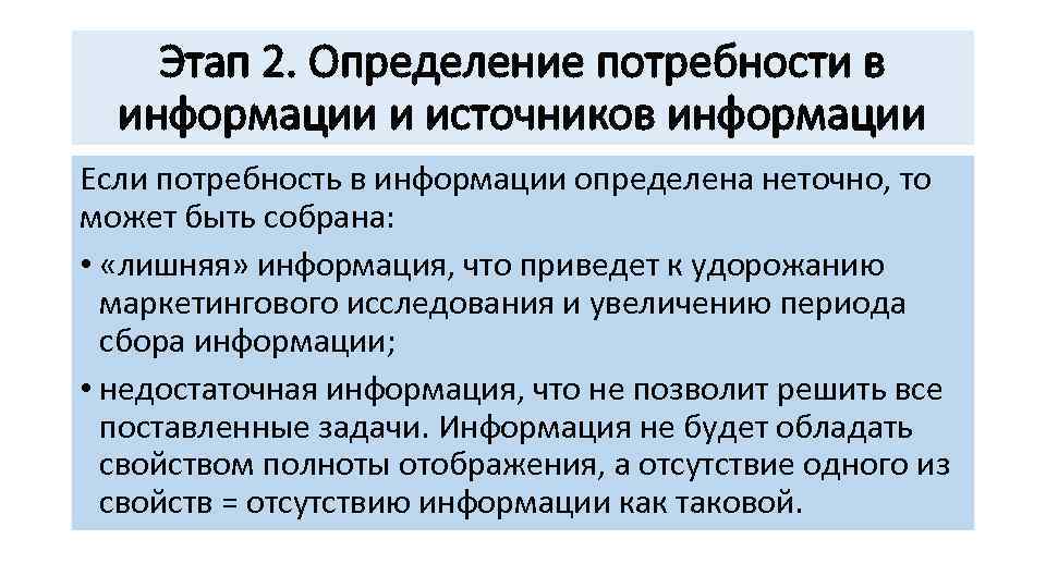 Этап 2. Определение потребности в информации и источников информации Если потребность в информации определена неточно, то может быть собрана: • «лишняя» информация, что приведет к удорожанию маркетингового исследования и увеличению периода сбора информации; • недостаточная информация, что не позволит решить все поставленные задачи. Информация не будет обладать свойством полноты отображения, а отсутствие одного из свойств = отсутствию информации как таковой.