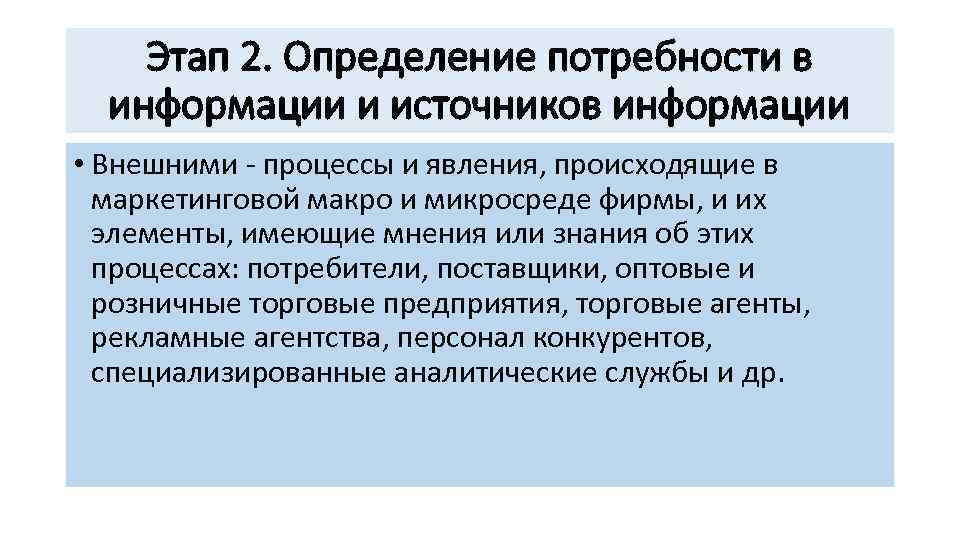 Этап 2. Определение потребности в информации и источников информации • Внешними процессы и явления, происходящие в маркетинговой макро и микросреде фирмы, и их элементы, имеющие мнения или знания об этих процессах: потребители, поставщики, оптовые и розничные торговые предприятия, торговые агенты, рекламные агентства, персонал конкурентов, специализированные аналитические службы и др.