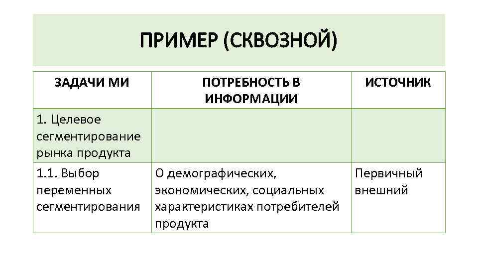 ПРИМЕР (СКВОЗНОЙ) ЗАДАЧИ МИ 1. Целевое сегментирование рынка продукта 1. 1. Выбор переменных сегментирования ПОТРЕБНОСТЬ В ИНФОРМАЦИИ О демографических, экономических, социальных характеристиках потребителей продукта ИСТОЧНИК Первичный внешний