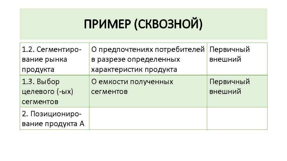 ПРИМЕР (СКВОЗНОЙ) 1. 2. Сегментиро вание рынка продукта 1. 3. Выбор целевого ( ых) сегментов 2. Позициониро вание продукта А О предпочтениях потребителей в разрезе определенных характеристик продукта О емкости полученных сегментов Первичный внешний