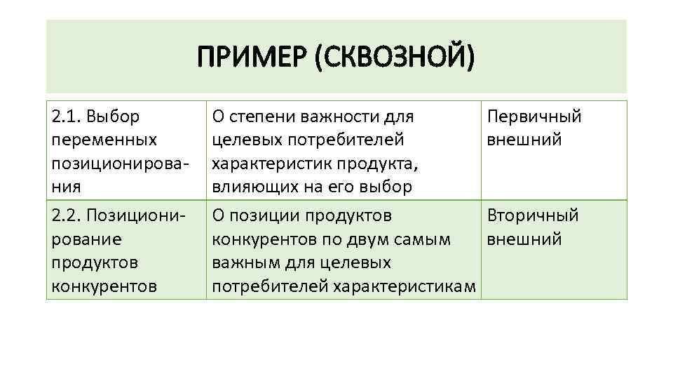 ПРИМЕР (СКВОЗНОЙ) 2. 1. Выбор переменных позиционирова ния 2. 2. Позициони рование продуктов конкурентов О степени важности для целевых потребителей характеристик продукта, влияющих на его выбор О позиции продуктов конкурентов по двум самым важным для целевых потребителей характеристикам Первичный внешний Вторичный внешний