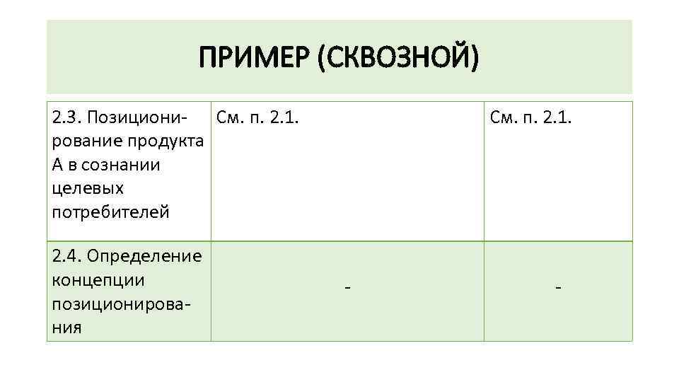 ПРИМЕР (СКВОЗНОЙ) 2. 3. Позициони См. п. 2. 1. рование продукта А в сознании целевых потребителей 2. 4. Определение концепции позиционирова ния См. п. 2. 1.
